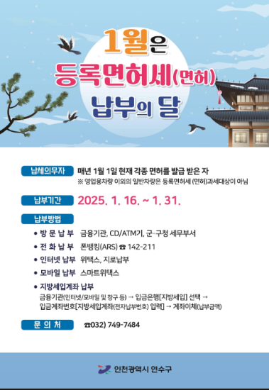 연수구 관계자는 “등록면허세는 지역 발전을 위한 소중한 재원으로 사용된다”며 “납부 기한 내 납부해 주시길 당부한다”고 말했다.