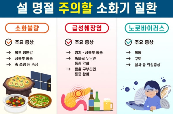 명절에 가장 흔한 소화기 증상 중 하나가 소화불량에 따른 복부 팽만감, 상복부 통증, 속 쓰림 등이 있다. 명절에는 전이나 갈비찜 등 고칼로리에 기름진 음식이 많고, 평소보다 식사량이 늘어나면서 과식을 하는 경우가 많은데 이 때 위에서 음식을 분쇄하고 이동시키는 소화 운동기능이 떨어지고, 위산 및 소화효소 분비에 변화를 주어 소화불량이 나타날 수 있다.