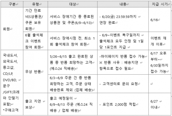 다만 예스24는 서비스 장애로 인한 피해 보상을 위해 1차 보상안을 발표했으나 이용자들 사이에서 불만이 폭주하고 있다. 보상안에는 출고 지연 고객에게 2,000포인트, 크레마클럽 구독자에게 30일 이용 기간 연장, 티켓 관람 불가 고객에게 티켓 금액의 120% 환불 등이 포함됐다.
