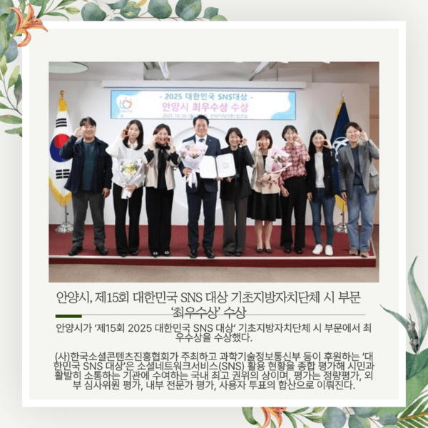 안양시가 ‘제15회 2025 대한민국 SNS 대상’ 기초지방자치단체 시 부문에서 최우수상을 수상했다.