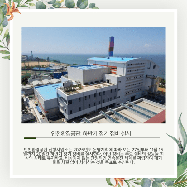 인천환경공단 신항사업소는 2025년도 운영계획에 따라 오는 27일부터 11월 15일까지 20일간 하반기 정기 정비를 실시한다. 이번 정비는 주요 설비의 성능을 최상의 상태로 유지하고, 비상정지 없는 안정적인 연속운전 체계를 확립하여 폐기물을 차질 없이 처리하는 것을 목표로 추진된다.