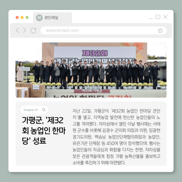 지난 22일, 가평군이 ‘제32회 농업인 한마당 큰잔치’를 열고, 지역농업 발전에 헌신한 농업인들의 노고를 격려했다.
