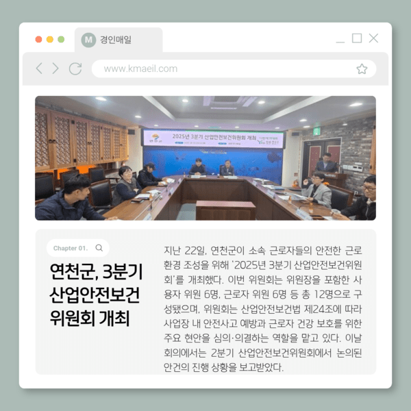 지난 22일, 연천군이 소속 근로자들의 안전한 근로환경 조성을 위해 ‘2025년 3분기 산업안전보건위원회’를 개최했다.