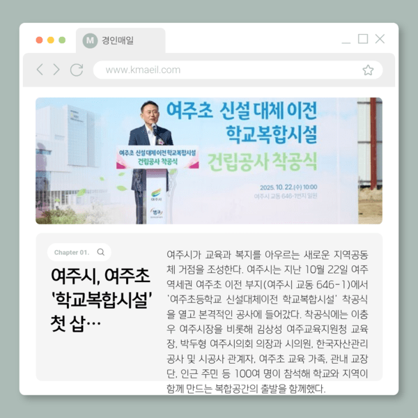 착공식에는 이충우 여주시장을 비롯해 김상성 여주교육지원청 교육장, 박두형 여주시의회 의장과 시의원, 한국자산관리공사 및 시공사 관계자, 여주초 교육 가족, 관내 교장단, 인근 주민 등 100여 명이 참석해 학교와 지역이 함께 만드는 복합공간의 출발을 함께했다.