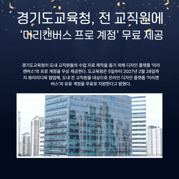 경기도교육청이 도내 교직원들의 수업 자료 제작을 돕기 위해 디자인 플랫폼 ‘미리캔버스’의 프로 계정을 무상 제공한다. 도교육청은 5일부터 2027년 2월 28일까지 ㈜미리디와 협업해, 도내 전 교직원을 대상으로 온라인 디자인 플랫폼 ‘미리캔버스’의 유료 계정을 무료로 지원한다고 밝혔다.