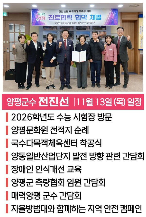 아울러 이날 일정으로 ▲대학수학능력시험 시험장 수험생 응원 방문 ▲양평문화원 전적지 순례 집결지 인사 ▲국수다목적체육센터 착공식 ▲양동일반산업단지 발전방향 간담회 ▲장애인 인식개선 교육 ▲양평군 측량협회 임원 간담회 ▲자율방범대와 함께하는 지역 안전 캠페인 등을 소개하며 "모든 일정에 함께하겠다"고 말했다.