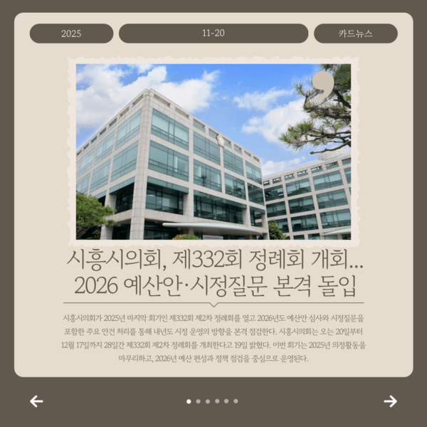 시흥시의회가 2025년 마지막 회기인 제332회 제2차 정례회를 열고 2026년도 예산안 심사와 시정질문을 포함한 주요 안건 처리를 통해 내년도 시정 운영의 방향을 본격 점검한다. 시흥시의회는 오는 20일부터 12월 17일까지 28일간 제332회 제2차 정례회를 개최한다고 19일 밝혔다. 이번 회기는 2025년 의정활동을 마무리하고, 2026년 예산 편성과 정책 점검을 중심으로 운영된다.