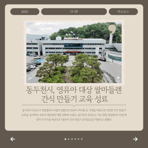 동두천시 보건소가 영양플러스사업의 일환으로 영유아 자녀를 둔 가정을 대상으로 건강한 간식 만들기 교육을 실시하며, 부모의 영양관리 역량 강화에 나섰다. 동두천시 보건소는 지난 18일 영양플러스사업 대상자 17가구를 대상으로 ‘영유아 간식 만들기 조리실습’을 마쳤다고 밝혔다.