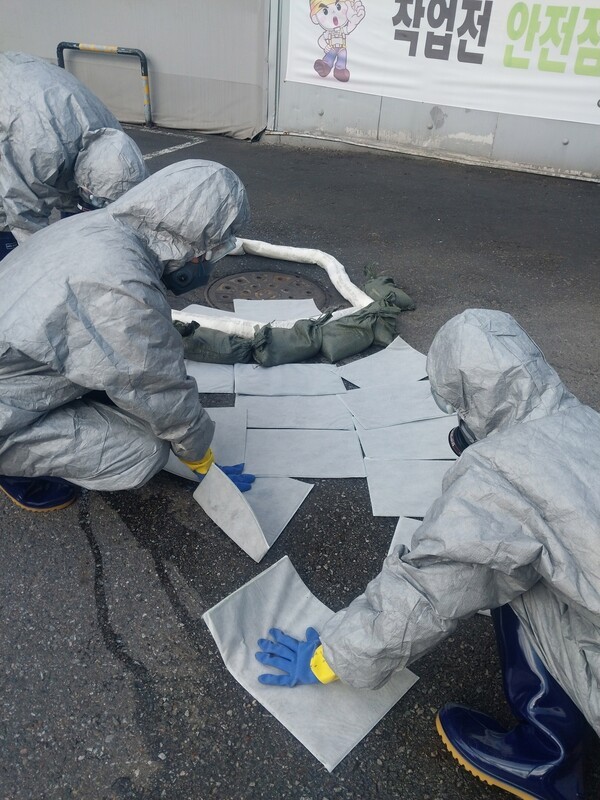 훈련에는 남동구 및 사업장 직원 등 20여 명이 참여해 보호의, 방독면 등을 착용한 상태로 케미컬 흡착포, 소석회 등을 이용한 방제작업을 진행했다. 또한, 사고 상황 전파 및 보고 처리 절차에 대한 점검도 병행했다.